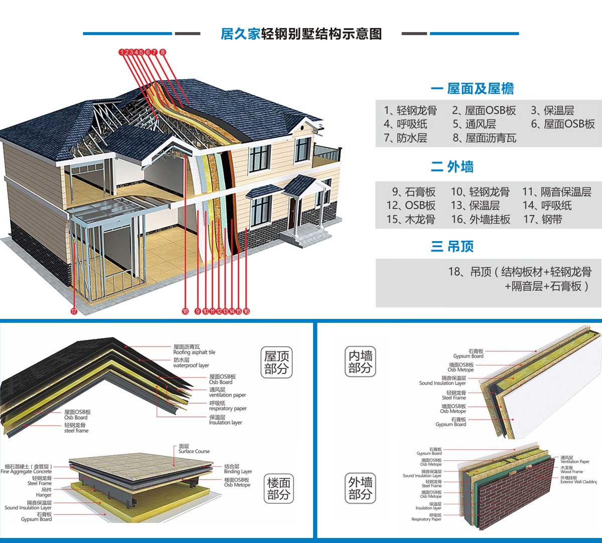 居久家輕鋼別墅隸屬于四川萬建城建筑工程有限公司,集科研、設(shè)計(jì)、咨詢、加工、生產(chǎn)安裝為一體。一直致力于新型輕鋼結(jié)構(gòu)房屋的研究、開發(fā)和應(yīng)用,倡導(dǎo)房屋建筑的設(shè)計(jì)和應(yīng)用在標(biāo)準(zhǔn)化、模塊化、通用化、規(guī)模化生產(chǎn)的同時(shí),實(shí)現(xiàn)人居環(huán)境的個(gè)性化、人性化、以及健康和舒適。 公司目前引進(jìn)具有國(guó)內(nèi)先進(jìn)水平輕鋼結(jié)構(gòu)房屋建筑技術(shù)和生產(chǎn)線,標(biāo)準(zhǔn)化、精細(xì)化和定制化設(shè)計(jì)、制造、安裝輕鋼結(jié)構(gòu)房屋。不僅能夠提供風(fēng)格各異的別墅建筑,同樣能夠提供行業(yè)標(biāo)準(zhǔn)的輕鋼樓宇建筑及建筑群。居久家裝配式房屋技術(shù)體系是高效節(jié)能型綠色建筑體系,各項(xiàng)建筑物理性能卓越,處于業(yè)內(nèi)先進(jìn)水平,能夠?yàn)榭蛻籼峁┤棠K化綠色建筑集成解決方案。